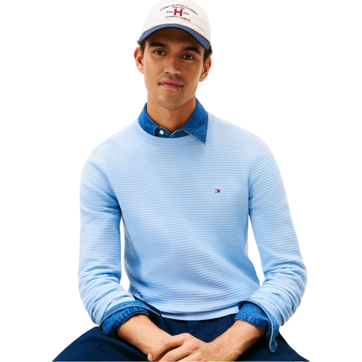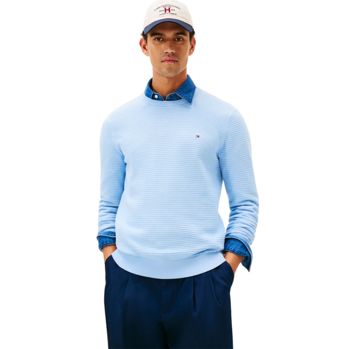 Med sin regular fit-pasform sidder strikken klassisk og komfortabelt. Den strukturerede overflade tilføjer dybde og karakter, mens det lille Tommy Hilfiger-logo på brystet giver et elegant finish.