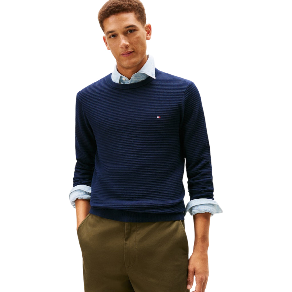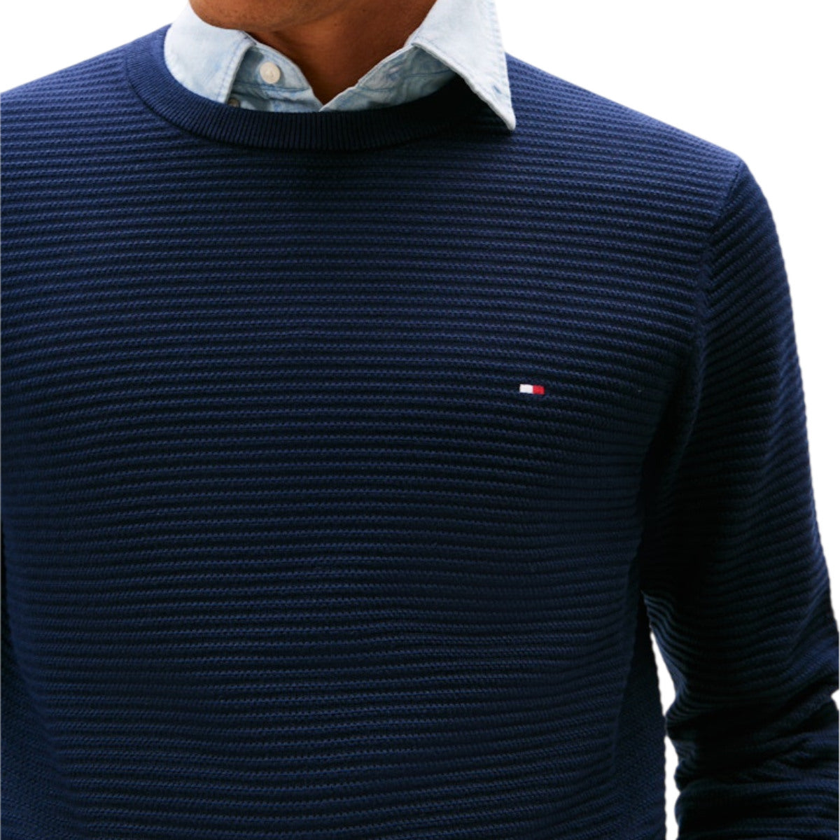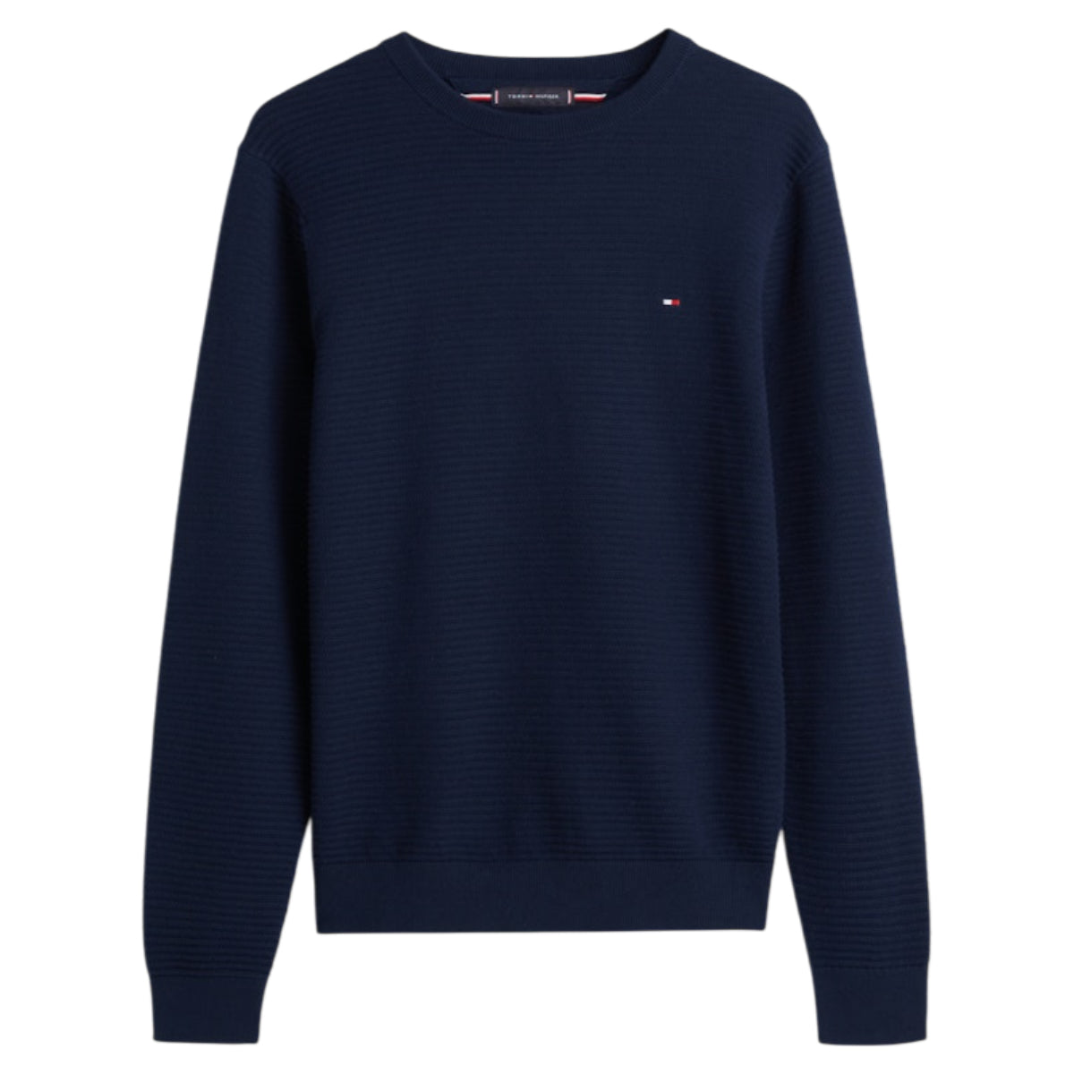 Med sin regular fit-pasform sidder strikken klassisk og komfortabelt. Den strukturerede overflade tilføjer dybde og karakter, mens det lille Tommy Hilfiger-logo på brystet giver et elegant finish.