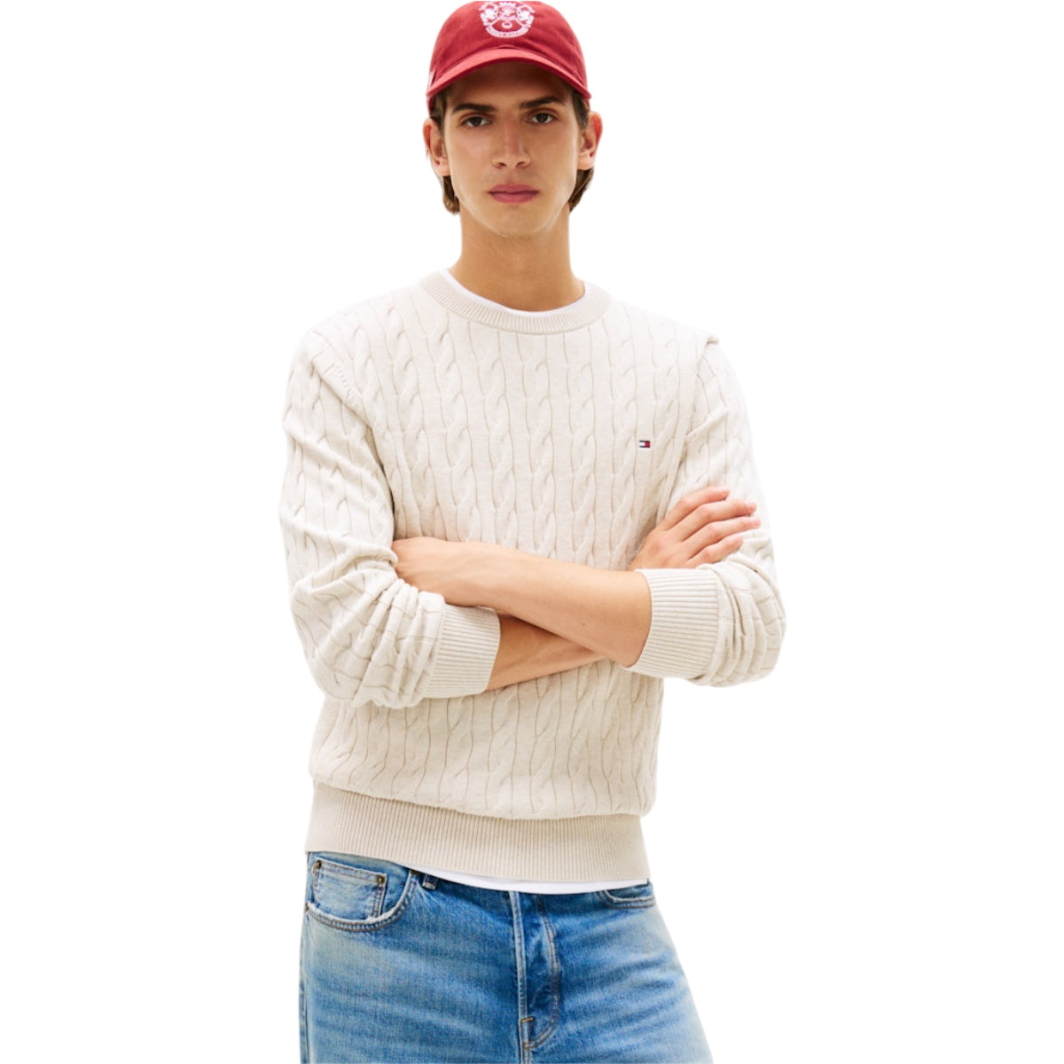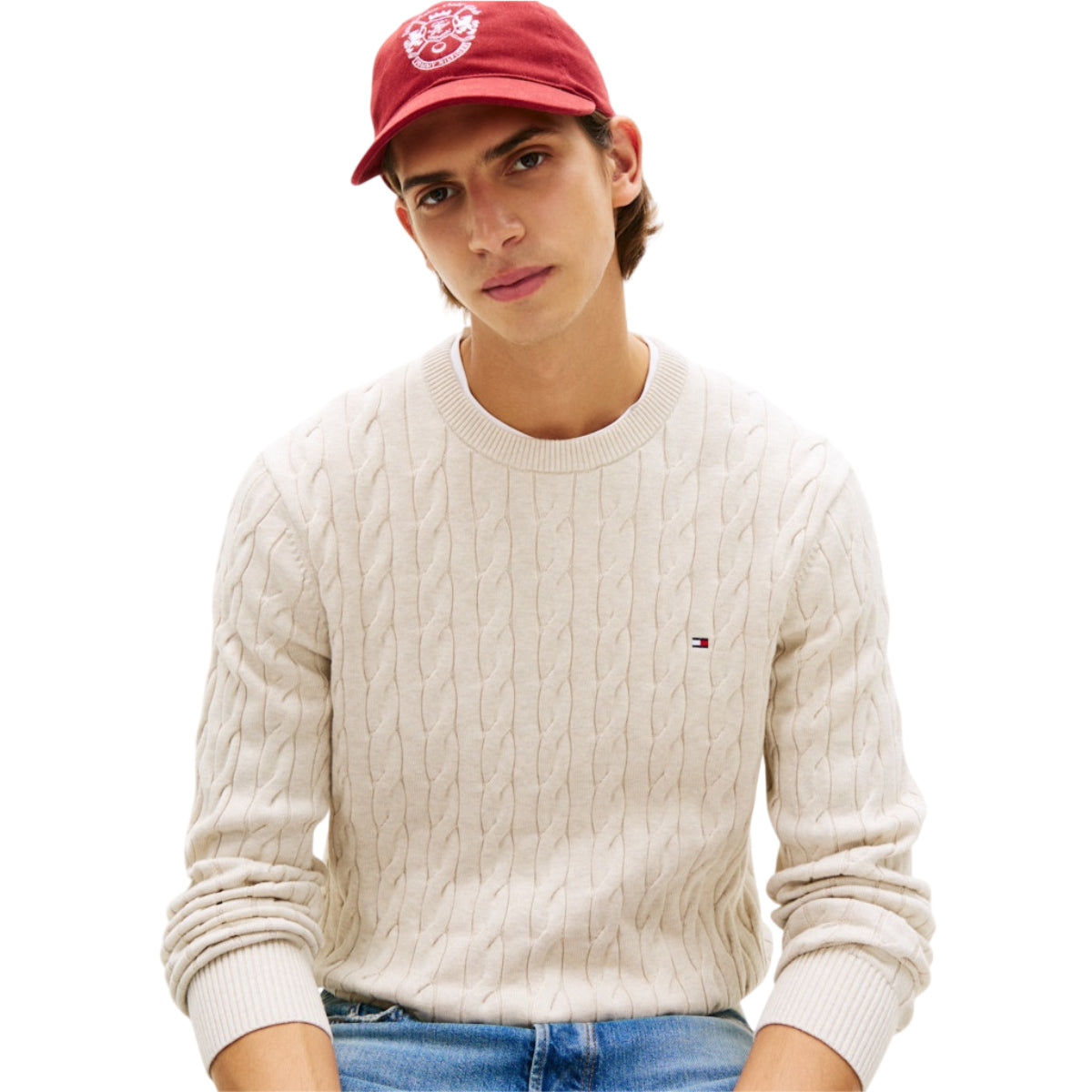 Tommy Hilfiger kabelstrik i blød bomuld er en tidløs klassiker, der forener enkelt design og komfort. Denne bomuldsstrik med klassisk kabelmønster har en regular fit-pasform, som giver en afslappet men velafbalanceret silhuet. Det bløde, åndbare bomuld sikrer god komfort og holdbarhed, hvilket gør trøjen velegnet til både hverdagsbrug og lag-på-lag-styling.