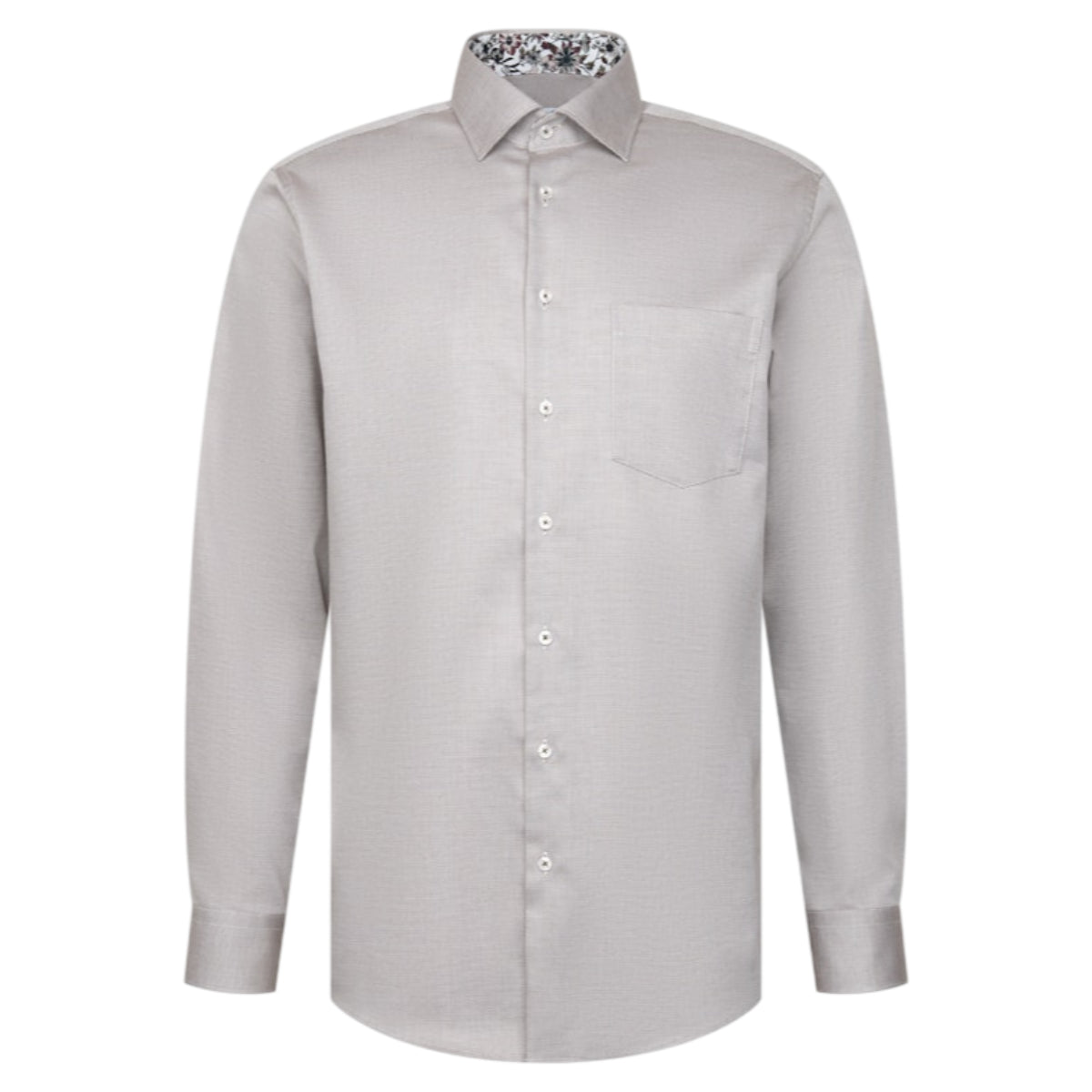 Denne ensfarvede skjorte med lange ærmer har et stilrent og tidløst look, løftet af et smart kontrastmønster i krave og manchet. Den klassiske brystlomme tilfører et subtilt finish og gør skjorten nem at style med både blazer, habit eller et par mørke jeans for et mere afslappet udtryk. Perfekt som hverdagsskjorte eller til mere formelle sammenkomster.